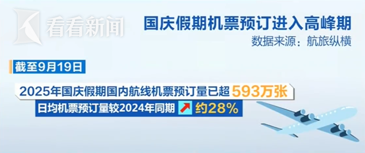 平台数据显示,截至9月19日,今年国庆假期,国内航线机票预订量已超593万张,日均机票预订量较去年同期增长约28%。