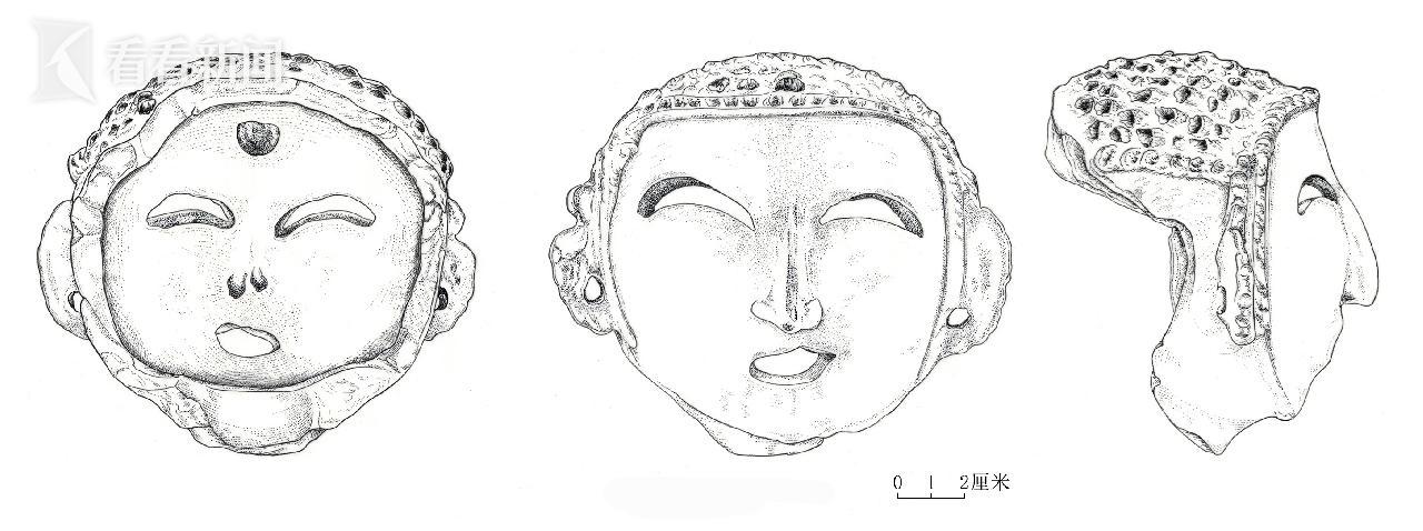 该像额头饱满,鼻梁为贴塑陶制。背面有残缺,推测为其它物品附着品。
