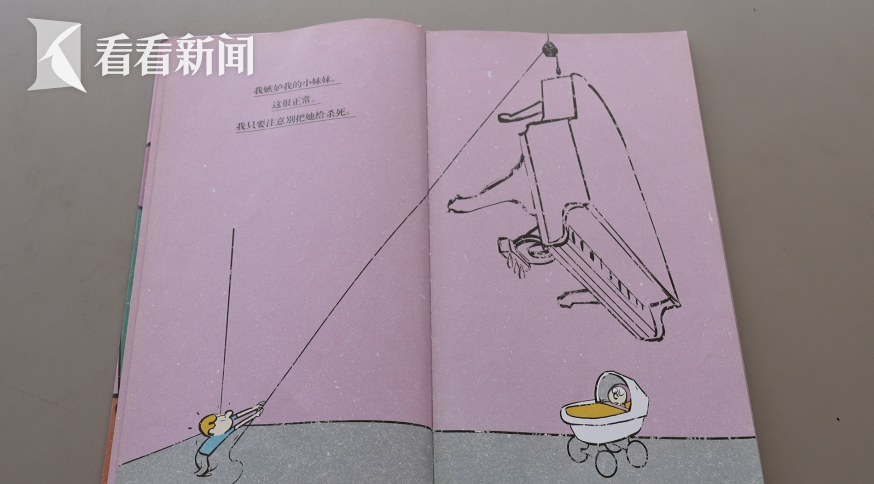 一架巨大的钢琴悬在婴儿车正上方,旁边配文写着“我嫉妒我的小妹妹,这很正常,我只要注意别把她给杀死”,此内容出自一本名为《家有家规》的儿童绘本。