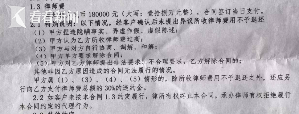 更离谱的是,合同里还藏着“霸王条款”:如果客户单方面解除合同,不仅不退律师费,还要额外支付30%的违约金。对此,律所工作人员表示,“我们已经没要你30%违约金了”,合着这意思是已经“手下留情”了呗?