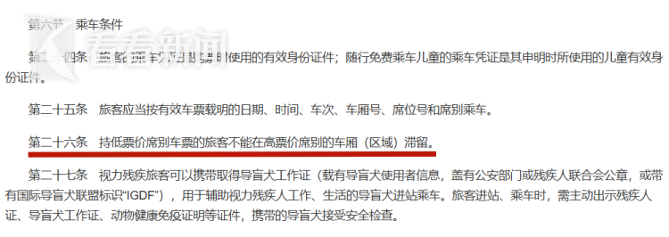 记者查询《铁路旅客运输规程》发现,其中明确规定“持低票价席别车票的旅客不能在高票价席别的车厢(区域)滞留”。在12306购票平台,无座票售价与二等座相同,但仅限在二等车厢使用。