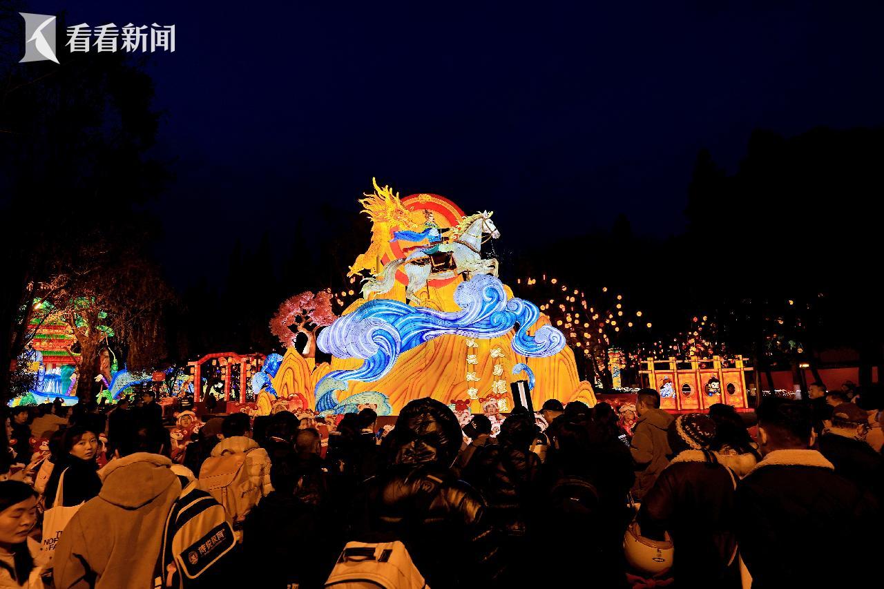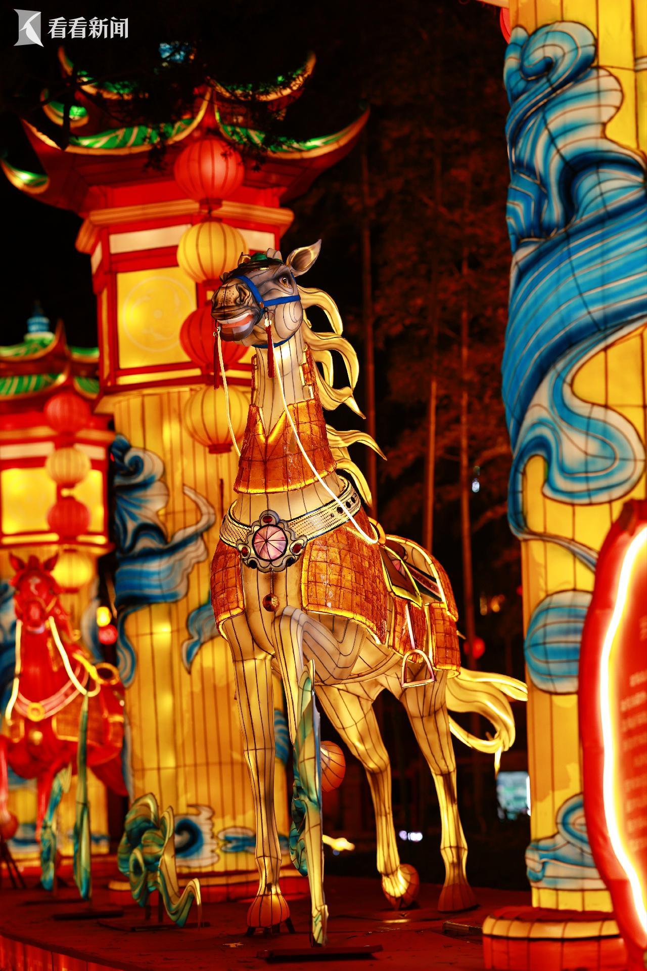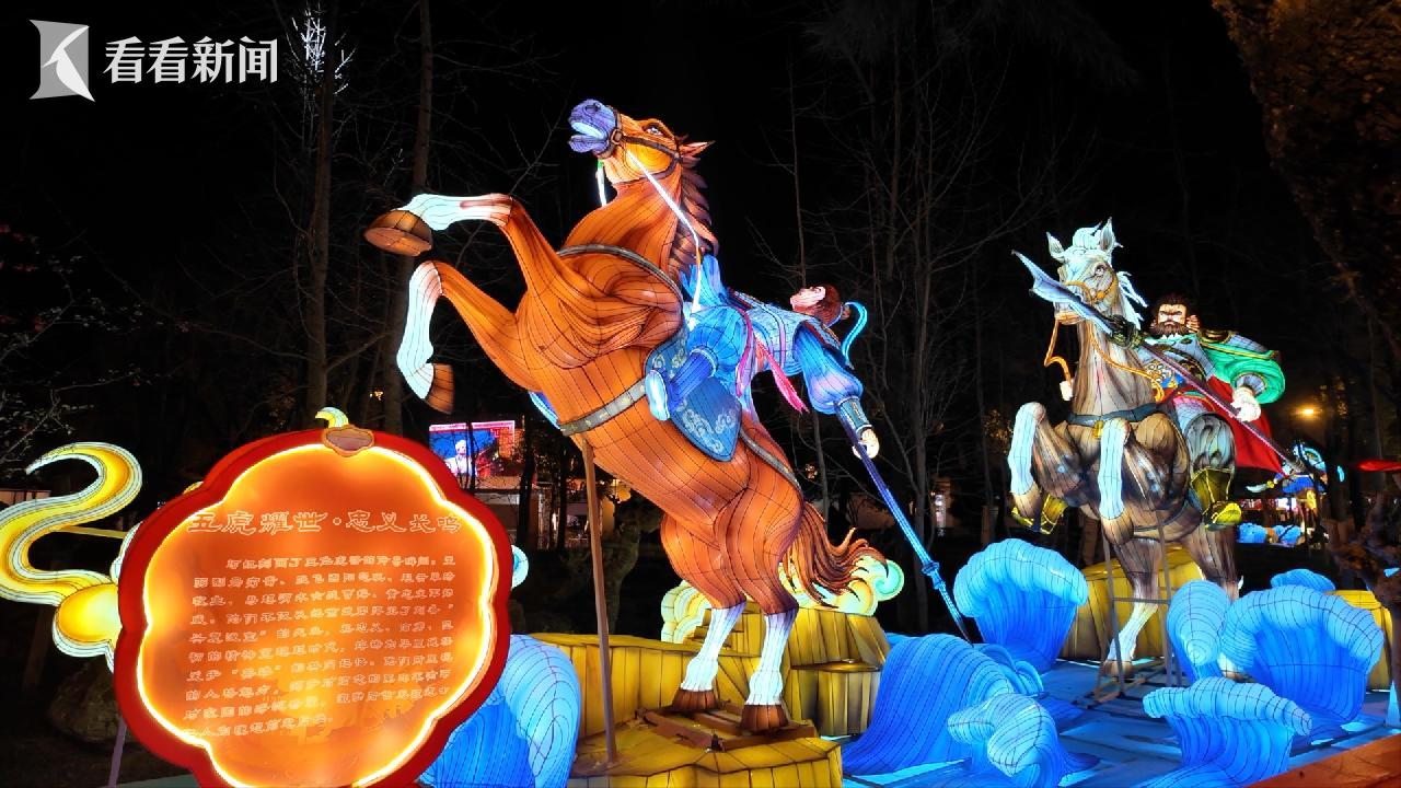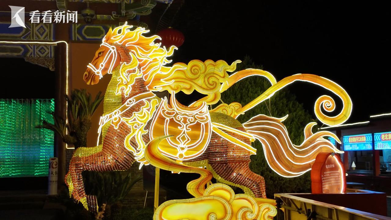 在庙会现场先睹为快,众多马元素灯组令人赞叹。“跃马檀溪·以兴汉室”灯组精准还原“的卢救主”的惊险瞬间。“流光赤焰”灯组以昂首嘶鸣的赤兔马形象,踏破红色祥云,展现骏马绝世风姿与忠义精神的融合。该灯组采用2.5万个回收小玻璃瓶,经专业消杀后,由非遗匠人手工注入颜料、捆扎造型,实现了环保与美学的有机统一。