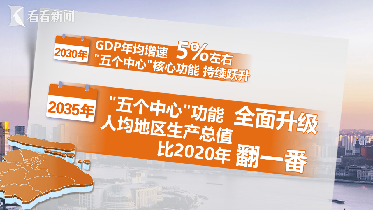 而到2035年,上海“五个中心”功能将全面升级,重要发展指标达到国际领先水平,人均地区生产总值比2020年翻一番,基本建成具有世界影响力的社会主义现代化国际大都市。