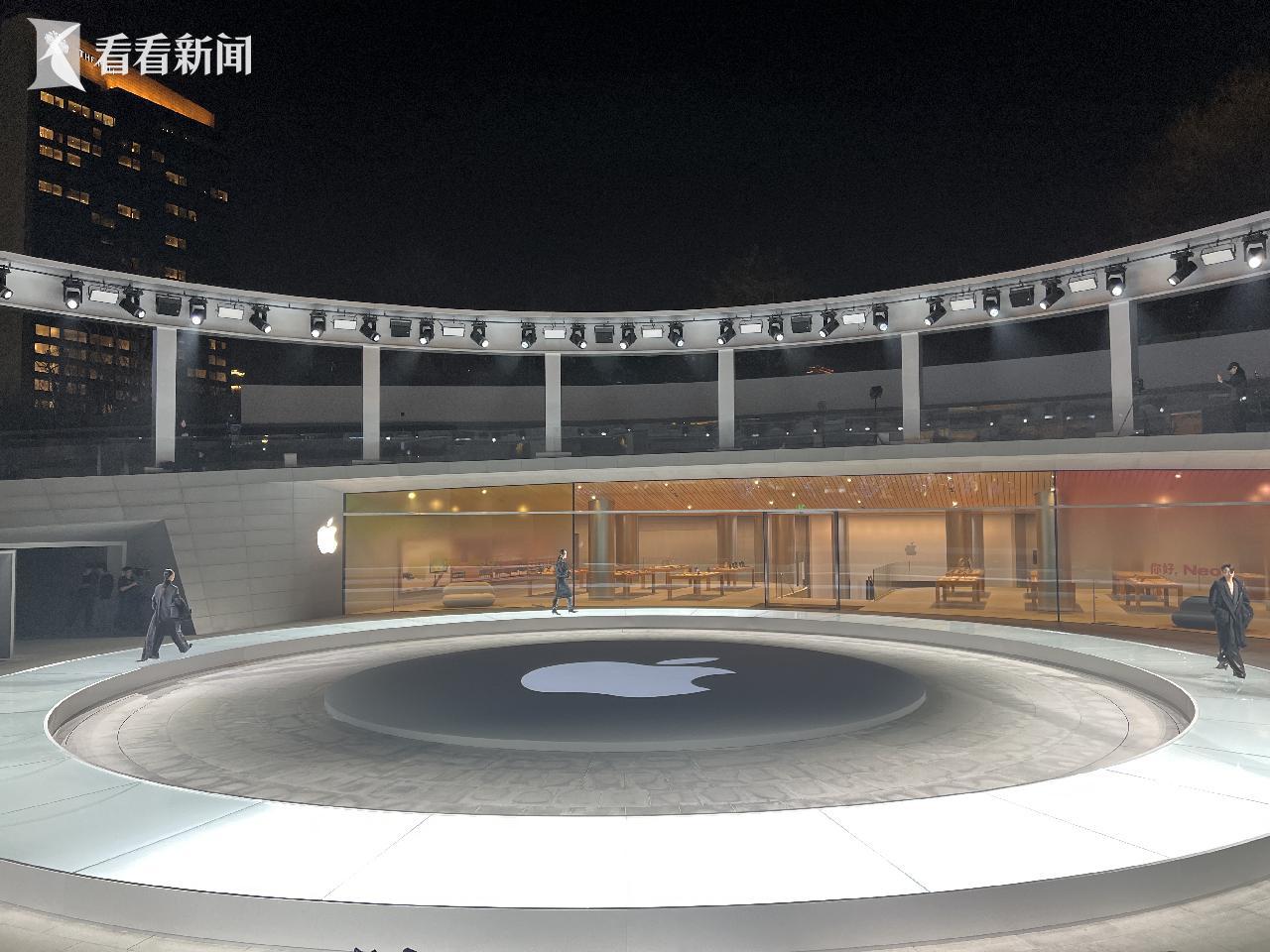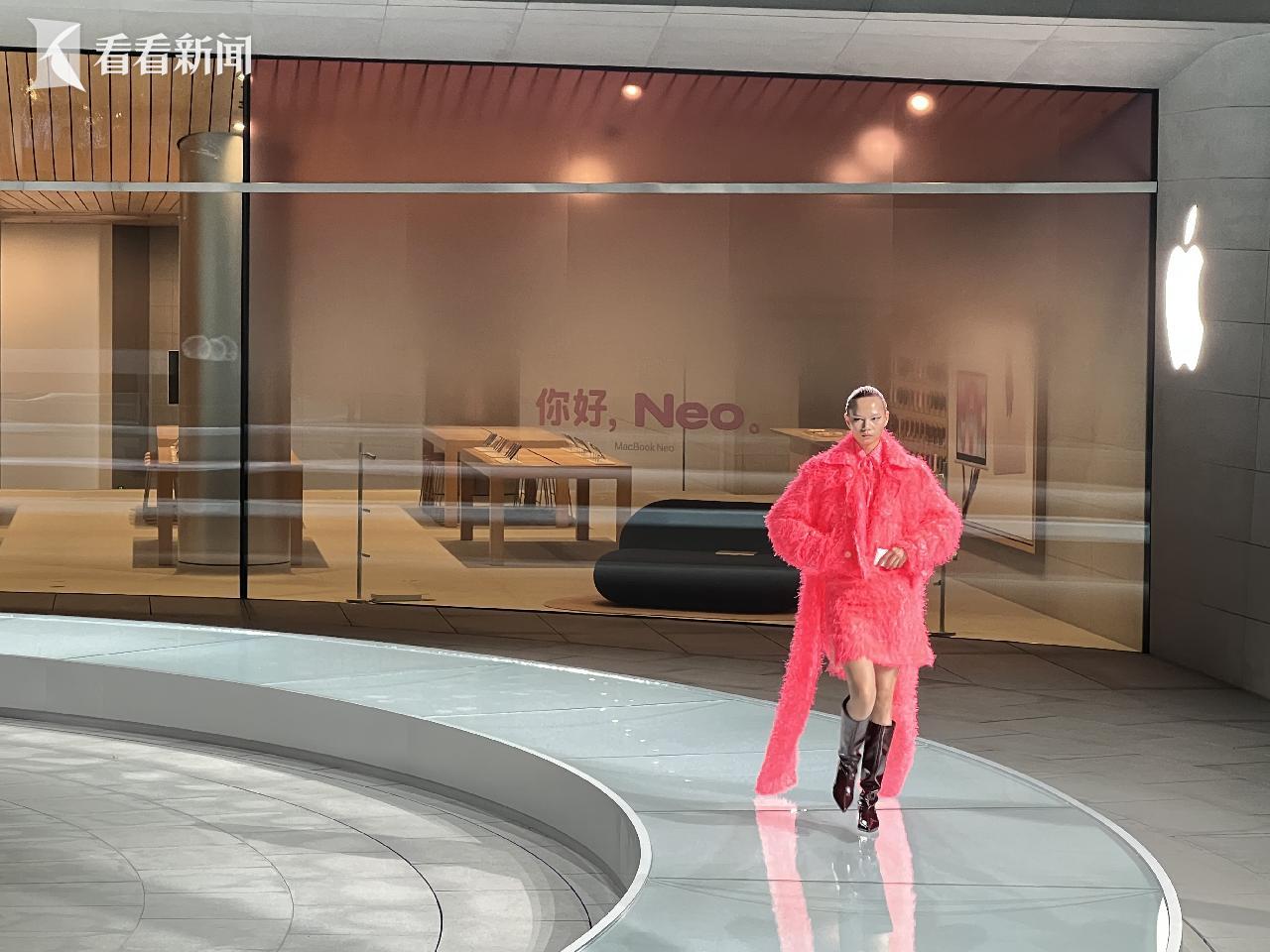 苹果静安店下沉广场上,苹果50周年特别企划时装秀惊艳亮相。晚上八点,圆环T台点亮,门店极简建筑化作天然秀场背景,与对面静安寺相映成景。