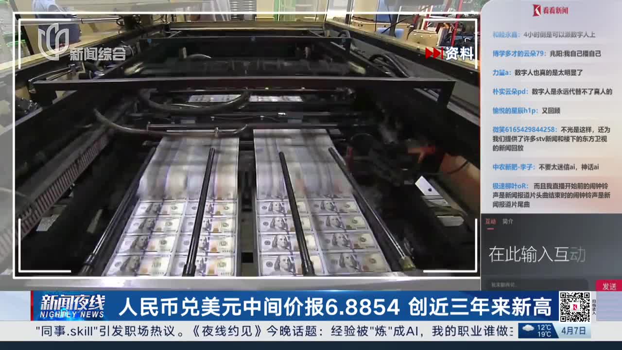 人民币兑美元中间价报6.8854 创近三年来新高