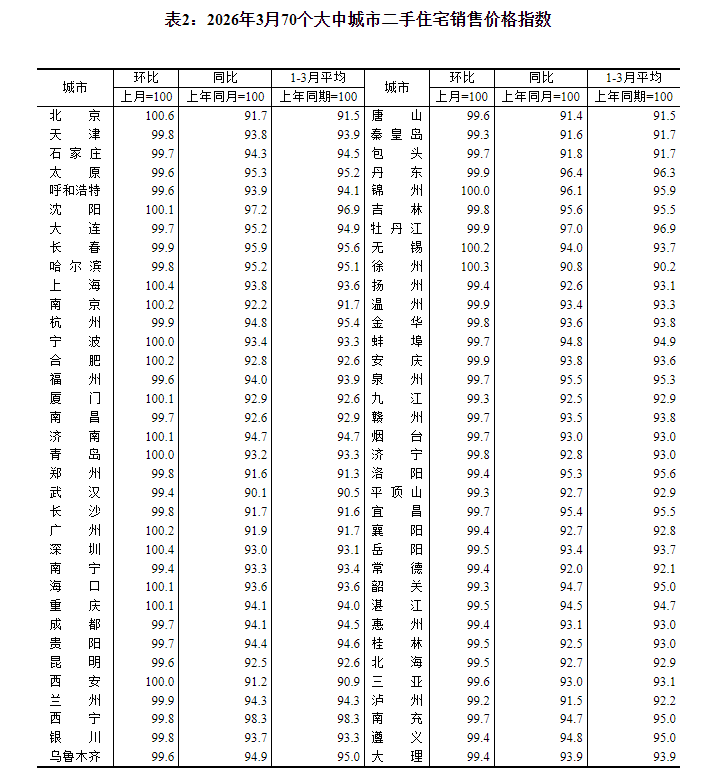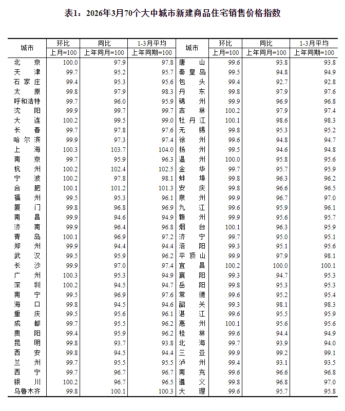 ——国家统计局城市司首席统计师王中华解读2026年3月份商品住宅销售价格变动情况统计数据