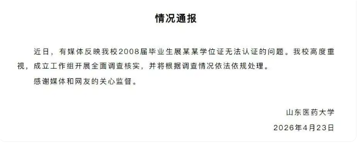 近日,原山东滨州医学院(现山东医药大学)毕业生展先生,因学位证在学信网无法查询,以“举报自己”的方式将遭遇公之于众,引发社会广泛关注。事件曝光后,山东医药大学于23日深夜发布情况通报,宣布已成立工作组,对事件开展全面调查核实。
