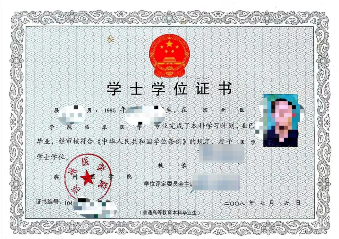 展先生介绍,自己于2008年7月完成原滨州医学院临床医学专业全部学业,顺利取得本科毕业证书。因在校期间发生打架行为,受到留校察看一年处分,当年未能获得学士学位证书。2009年,其留校察看期满后,接到学校领取学位证的通知,随后到校领取了纸质版临床医学专业学士学位证书。