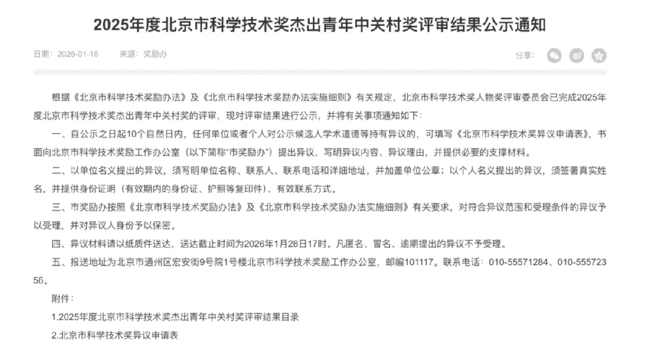1月19日,北京市科学技术委员会、中关村科技园区管理委员会官网发布了《2025年度北京市科学技术奖杰出青年中关村奖评审结果公示通知》。
