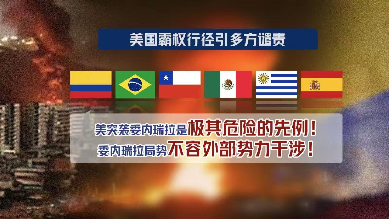 哥伦比亚、巴西、智利、墨西哥、乌拉圭和西班牙6国发表联合声明,称美突袭委内瑞拉违反了国际法和《联合国宪章》基本原则,为地区和平与安全开创了“极其危险的先例”。声明强调委内瑞拉局势必须由委人民主导,不容外部势力干预。