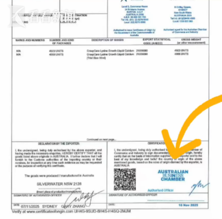 记者多次向商家索要原产地证明和自由销售证,都未获得回复,后来虽然通过平台客服间接拿到了商家提供的原产地证明,但该证明显示产品产自澳大利亚,和报关单贸易国为新西兰不一致。记者进一步调查发现,该原产地证明系伪造。