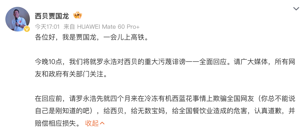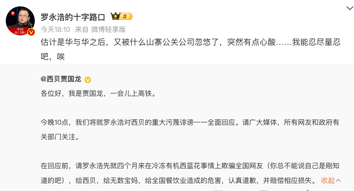 又要火拼了?西贝创始人贾国龙再次硬刚罗永浩:今晚10点,全面回应罗永浩对西贝的重大污蔑诽谤,还要求对方道歉并赔偿损失。而罗永浩的回应相当“轻飘飘”:估计又被什么山寨公关公司忽悠,尽量忍吧。