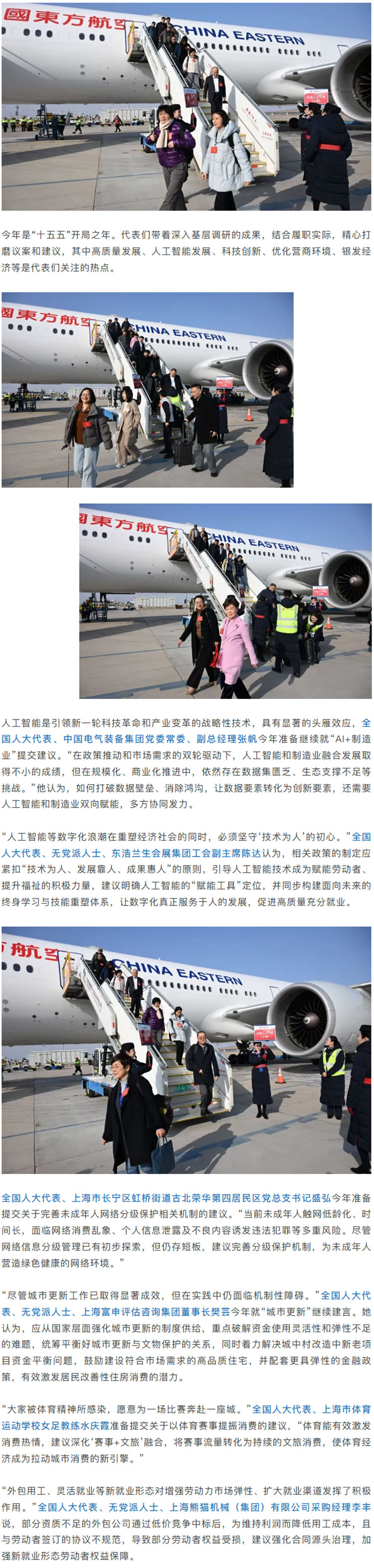 今天(3月3日)下午,43位在沪全国人大代表抵达北京,出席即将召开的十四届全国人大四次会议。