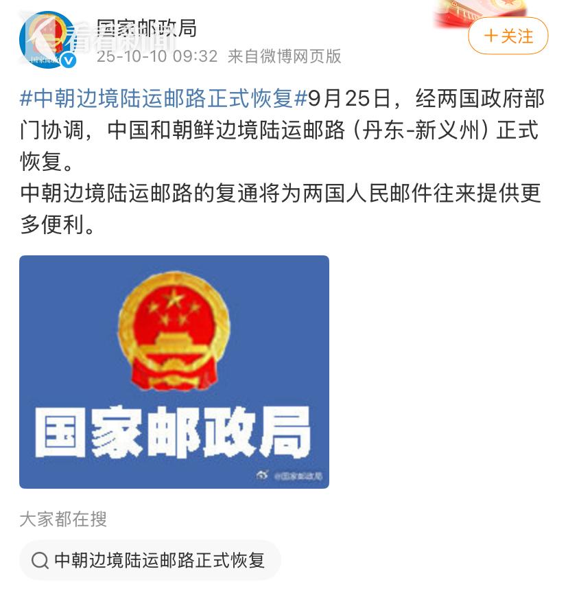 国家邮政局10月10日发布消息:9月25日,经两国政府部门协调,中国和朝鲜边境陆运邮路(丹东-新义州)正式恢复。