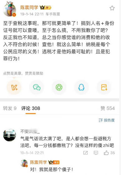 早在2019年陈震就曾在微博痛批偷税漏税的行为,表示逃税最可耻,是犯罪行为。曾有网友留言提醒他话不要说的太满,不会有一分钱都不少缴的傻子,而陈震的回复是:我就是那个傻子!