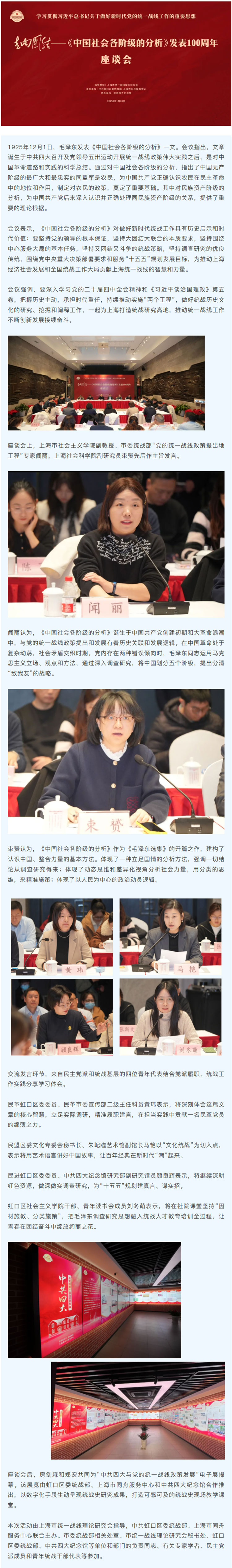 11月28日上午,“走向团结——《中国社会各阶级的分析》发表100周年”座谈会在中共四大纪念馆举办。活动旨在传承毛泽东等老一辈革命家的统战思想和智慧,推动工作创新发展。市委统战部副部长房剑森出席会议并讲话,虹口区委常委、统战部部长郑宏出席会议。
