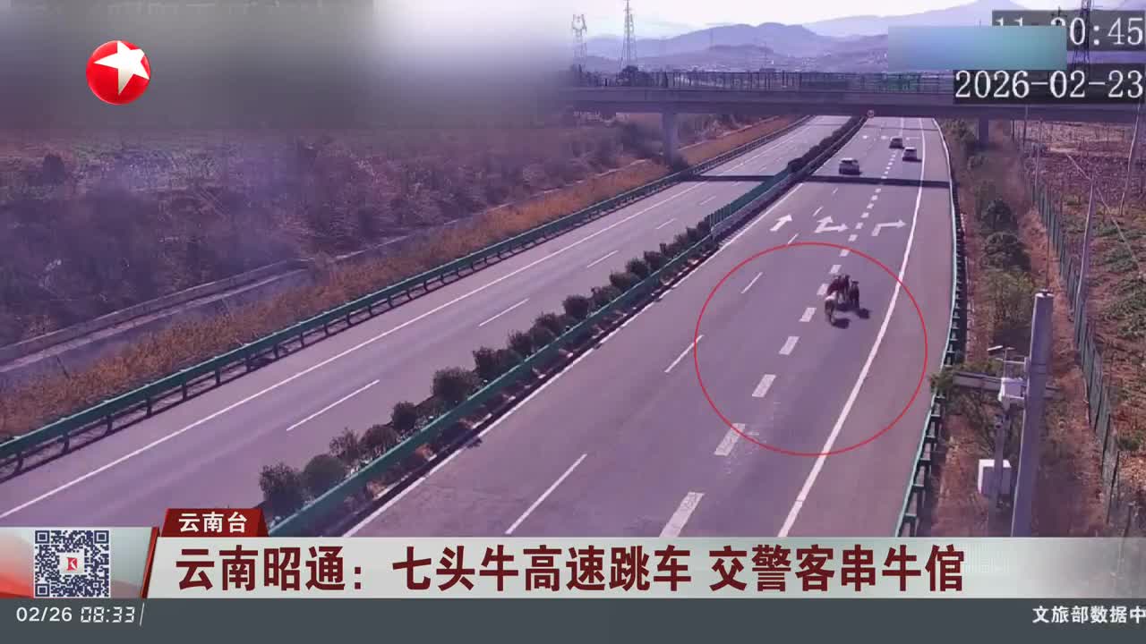 云南昭通:七头牛高速跳车 交警客串牛倌