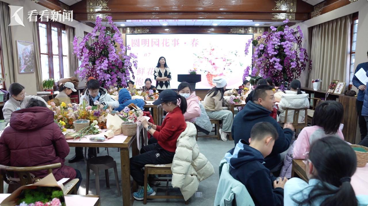 鲜花抱抱桶、莲蓬挂件等手作体验课人气火爆,游客在专业老师的指导下,用双手定格自然园林之美,现场还有书法家为游客免费书写福字和春联。非遗市集设置了文创区、手作区和互动区,古代《胤禛美人图》中的十二美人化身十二花神,走出古画与市民游客互动。