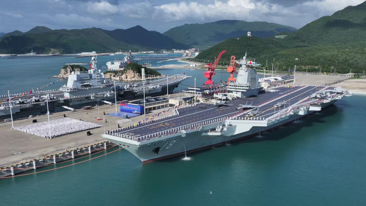 11月5日,我国第一艘电磁弹射型航空母舰福建舰入列授旗仪式在海南三亚某军港举行。福建舰是我国第一艘电磁弹射型航空母舰,也是我国第三艘航空母舰,舷号为“18”,2022年6月下水命名。福建舰的入列标志着,人民海军正式步入“三航母”时代。