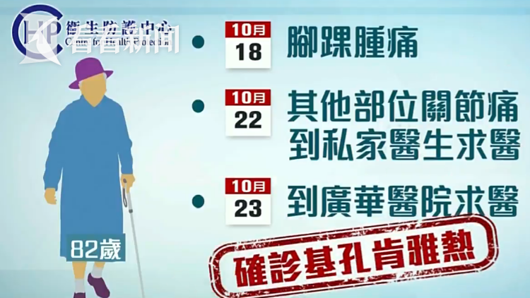 这名患者10月18日开始脚踝肿痛,4天后发烧伴有手脚关节疼痛,随后找私家医生求医,次日到广华医院急诊室,确诊感染基孔肯雅热。由于患者过去个半月,包括潜伏期没有外出旅游纪录,因此确定为香港本地个案。她住所附近20座大楼共8000户、过万人有较大感染风险。