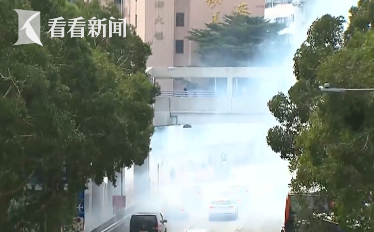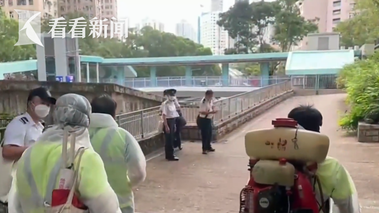 在新增患者的住所对面,香港食环署工作人员正在施放灭蚊喷雾,远处可以看到烟雾弥漫。