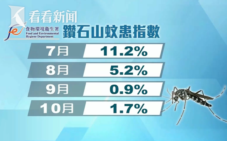 香港食环署在钻石山的分区诱蚊器指数显示,自8月以来都少于10%,这反映了蚊患不算严重,但相关负责人强调会加强灭蚊。