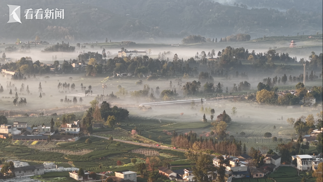 凭借动车在茶乡中穿雾而过的绝美画面,近期,雅安名山骑龙村万亩茶园在网络上火爆出圈。视频中的现实版《千里江山图》,出自雅安本地摄影爱好者“貔貅”之手。为捕捉这一瞬间,他连续半个月蹲守红星镇长岗山,记录动车穿行于云海茶田之间的震撼瞬间。