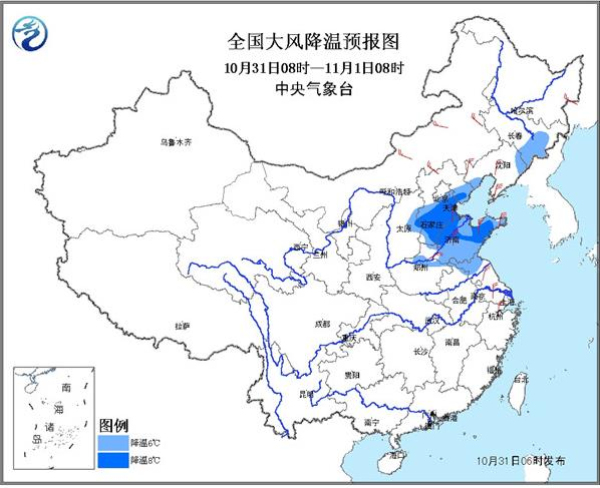 今天,冷空气继续东移南下,对华北、黄淮一带的影响开始显现。中央气象台预计,10月31日至11月1日,冷空气自北向南影响我国东部地区。受其影响,东北地区东南部、华北中东部、黄淮、江淮大部等地将有4~6℃降温,其中华北东部、黄淮东部等地的部分地区降温可达8℃以上,上述部分地区并伴有4~6级偏北风;为此,中央气象台于10月31日06时继续发布大风降温预报。