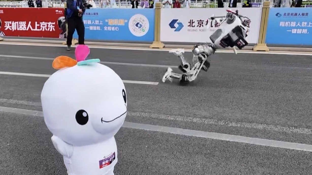 荣耀绝影赤兔队的“闪电”机器人全程保持领先,以惊人速度逼近终点线。就在距终点仅数米处,“闪电”突然失衡摔倒,撞向护栏,现场观众与工作人员瞬间屏息 。短暂停顿后,这台红色涂装的机器人在工作人员帮助下,爬起继续冲线,最终以48分19秒净成绩,成为本届赛事首个冲过终点线的机器人,完成21.0975公里半程挑战,该机器人也是首个出发的选手。