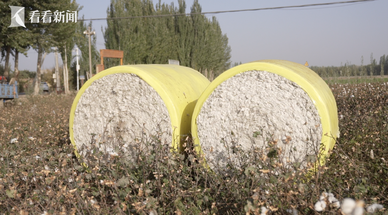 采棉机穿梭于雪白的棉海,仅需10分钟就能自动打包出一个重达1吨的“蛋卷”。