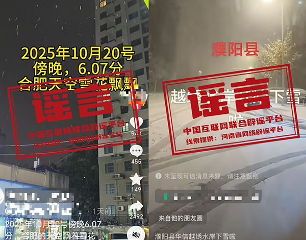 真相:近期,多地迎来降温,网络上陆续出现“2025年10月20日傍晚合肥天空雪花飘飘”“安徽淮南下雪了”“河南濮阳下雪”等内容的视频,引发关注。经河南濮阳,安徽合肥、淮南等地气象部门核实,近期未监测到降雪情况,上述信息系谣言。(来源:河南省网络辟谣平台、@大皖新闻)