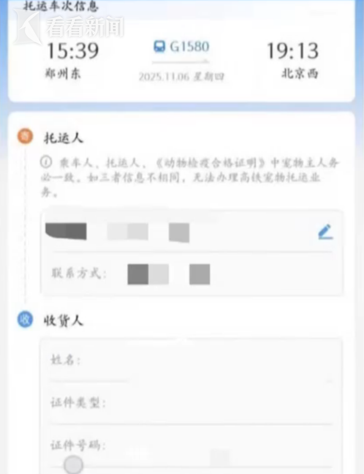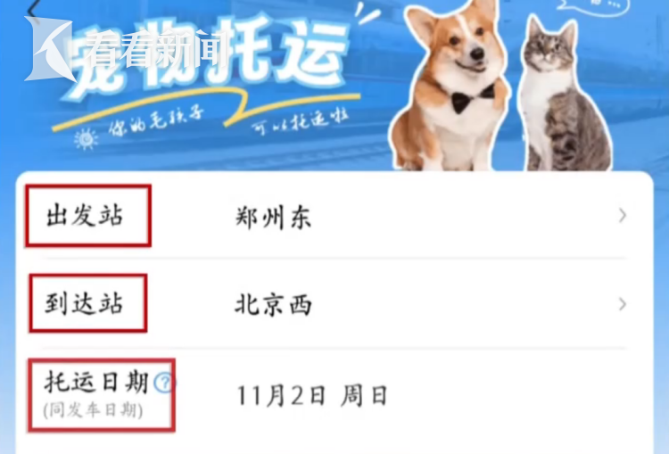 首先,购票页面在相应车次旁标注“宠”字,旅客本人购票成功后,页面会自动显示宠物托运入口。在这里点击预约下单,选择出发站、到达站和托运日期,系统会实时显示剩余舱位情况。