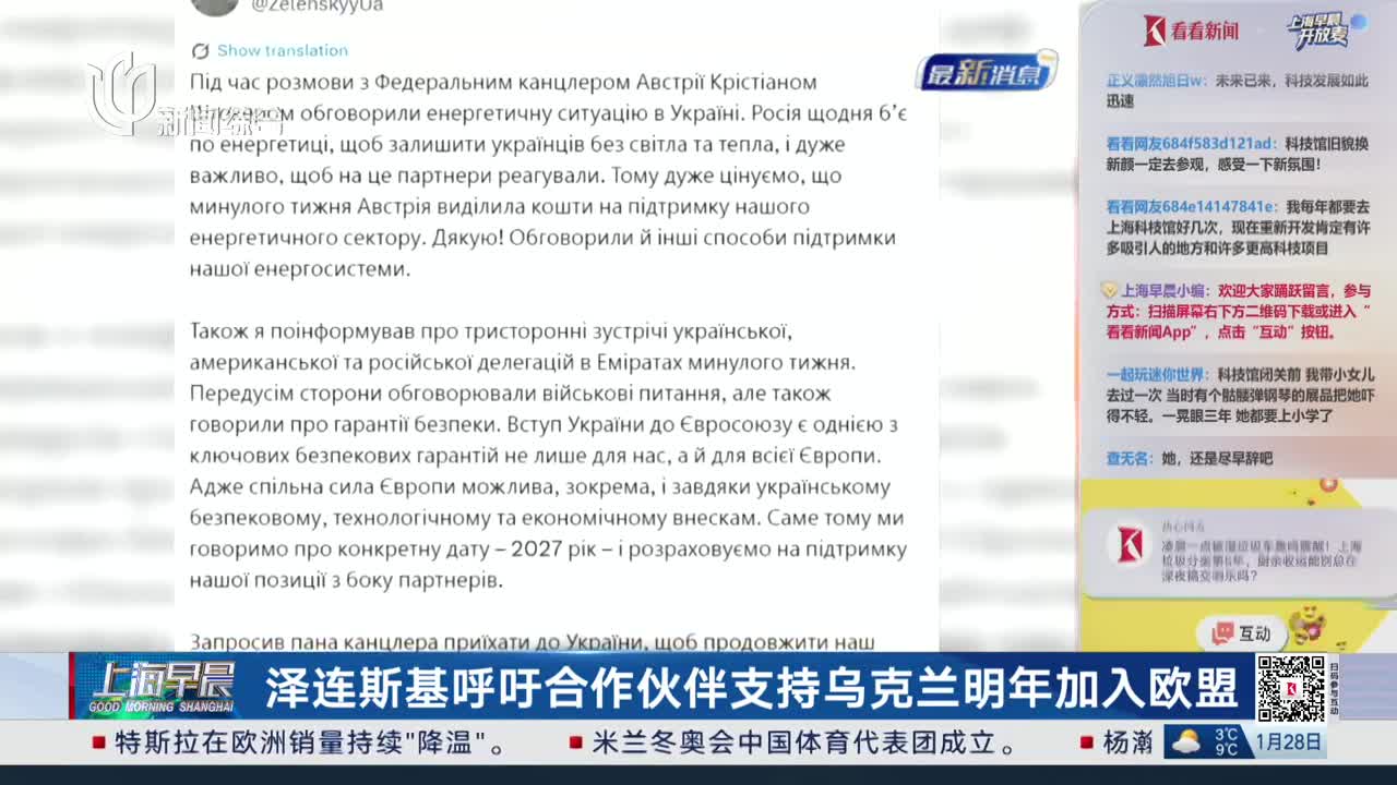 泽连斯基呼吁合作伙伴支持乌克兰明年加入欧盟