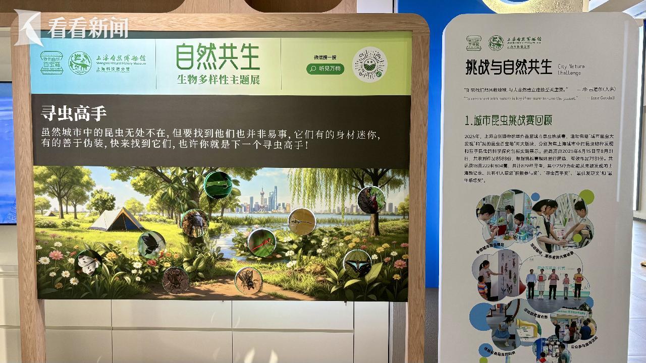 本次主题展作为上海自然博物馆 “自然共生”生物多样性主题展的延续,以“人与自然和谐共生”为核心,分为“你我与自然共生”、“挑战与自然共生”两大板块,系统展示本年度公众科学项目、首届城市昆虫挑战赛的成果及“我的自然百宝箱”跨界作品。展览特别设置“寻虫高手”互动区,观众可通过翻转昆虫知识卡片、在微缩景观中寻找隐藏昆虫等互动形式,轻松了解城市生态的多样性与保护意义。