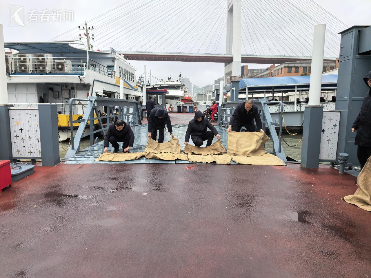在雨雪天气下,轮渡工作人员第一时间开展营运区域现场巡查,及时清除积水积冰,铺设麻袋、草包、防滑垫,放置警示牌,宣传提示乘客下车推行、缓步慢行,全力保障乘客安全出行,以贴心服务,守护出行平安。轮渡公司将以“时时放心不下”的责任感,坚守营运一线,用实际行动化解寒潮带来的不利影响,保障市民出行安全顺畅。