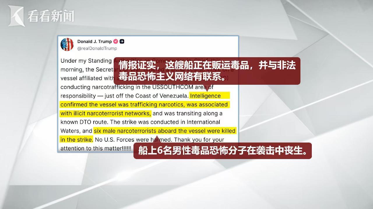 特朗普在社交媒体发文称,情报证实,事发时被击沉船只在委内瑞拉海岸附近贩运毒品,并与“非法毒品恐怖主义网络”有联系。他将死者称为“毒品恐怖分子”,但未说明他们属于哪个贩毒集团。