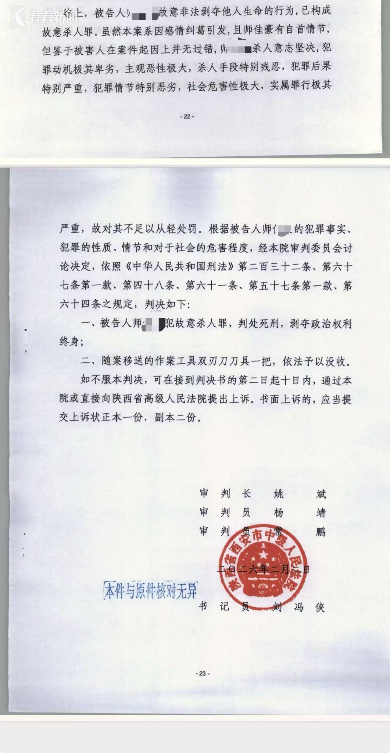 2月10日下午,被男友杀害护士父亲告诉看看新闻Knews记者,已经收到陕西省西安中级人民法院的判决书。此前2月2日,陕西省西安中级人民法院对“西安31岁女护士遭男友杀害”案件作出一审宣判,被告人师某某犯故意杀人罪,判处死刑,剥夺政治权利终身。同时,随案移送的作案工具双刃刀刀具一把,依法予以没收。
