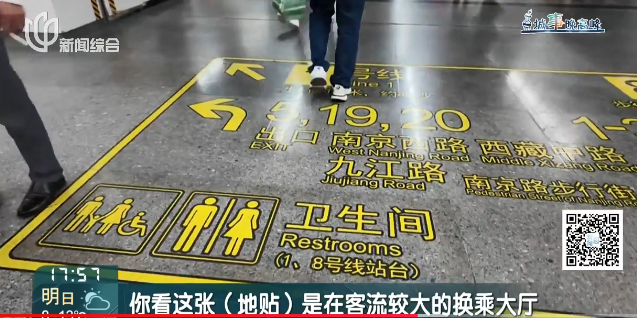 熊熊 人民广场站站长:我们已经有了,其实我们是组合式的一个信息。换乘大厅上的几个门洞每个都有无障碍的厕所,包括地贴也是非常清晰的。所以前面你和我交流说厕所要做更多导向,乘客觉得还不够多,但是其实你看每个都有,我这里面积实在太大了,大站要很多信息兼顾,我们有18个出入口包括"无障碍电梯""寄存柜的"信息。