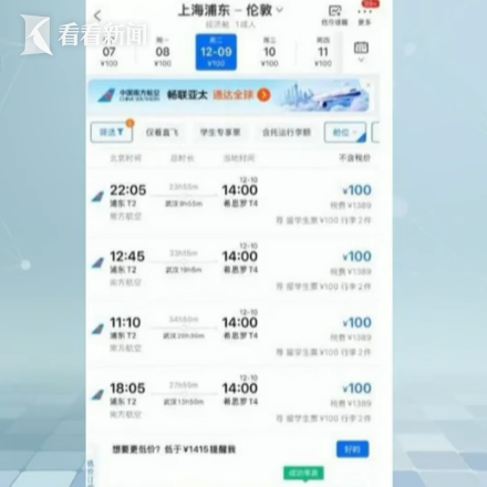 在携程平台选中不含税价条件后发现,12月9日,从上海浦东飞往英国伦敦的十多趟航班的机票价低至100元。持续至12月29日,均有100元(不含税)价位的航班。而在剔除不含税价条件后,含税机票价最低为1489元。