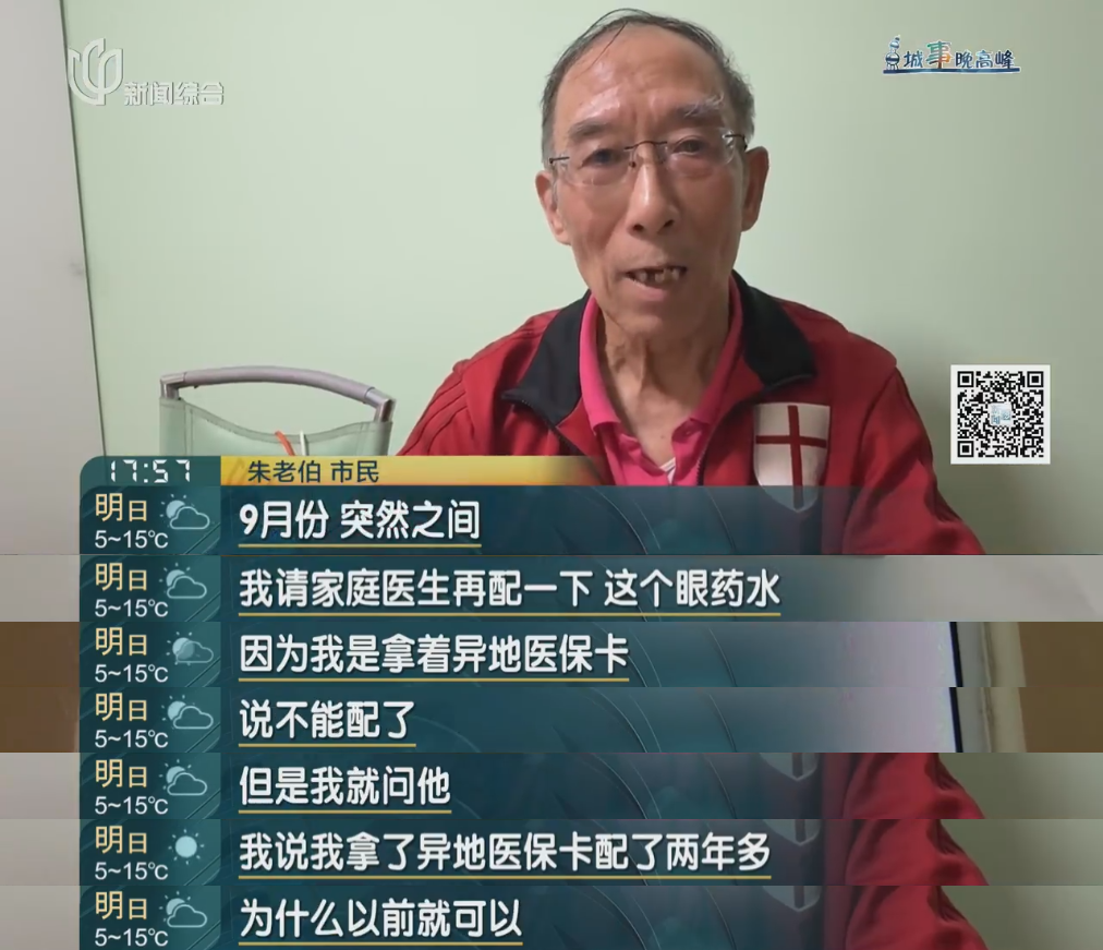 今年79岁的朱老伯退休前在浙江工作,退休后才把户口迁回上海。多年来,他拿着自己的异地医保卡看病、配药,都挺顺利。
