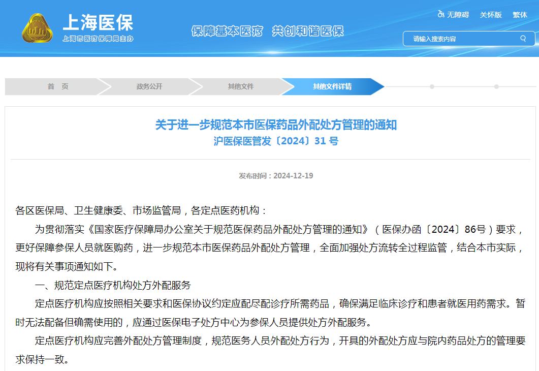 据了解,去年12月份,由本市医保局、卫健委、药监局联合下发《关于进一步规范本市医保药品外配处方管理的通知》,文件明确规定,本市参保人员、按参保地规定,办理了跨省异地就医备案手续的异地参保人员,都能享受相关外配处方,从政策上并无问题。因此,上海市医保局相关负责人表示,问题可能还是出在上海市卫健委的延伸处方环节。