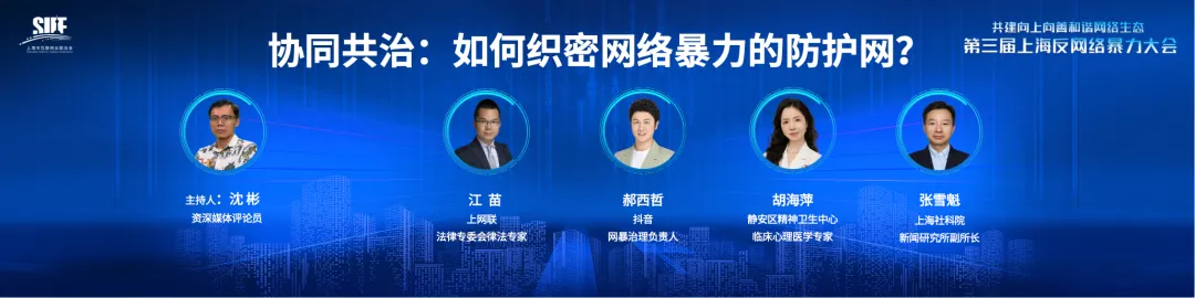 圆桌讨论环节由资深媒体评论员沈彬主持,邀请上网联法律专委会律法专家江苗、抖音网暴治理负责人郝西哲、临床心理医学专家胡海萍、上海社科院新闻研究所副所长张雪魁,共同围绕谣言治理、技术防控、心理疏导、网暴认定标准等议题展开深入探讨。嘉宾一致认为,网络暴力治理需要法律的刚性约束、技术的精准赋能、媒体的正向引导以及社会各界的协同发力,须构建全方位、多层次的治理体系,从根本上遏制网络暴力,守护网络空间的文明与和谐。