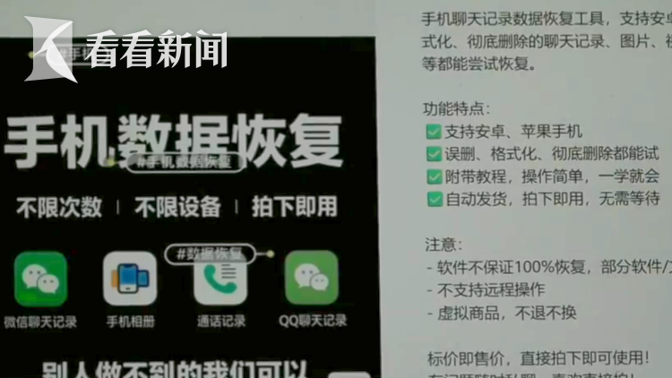 然而普通的删除或恢复出厂设置往往只是将数据标记为无效,数据本身仍可能残留在存储介质中。在某二手交易平台上,就有不少软件在售,号称可以恢复被误删或格式化的手机文件。看看新闻Knews记者购买了其中一款进行测试。在删掉手机内两张照片和一段视频后,按提示使用软件对照片进行恢复,那两张被删去的照片果真出现在了电脑弹出的文件夹内。