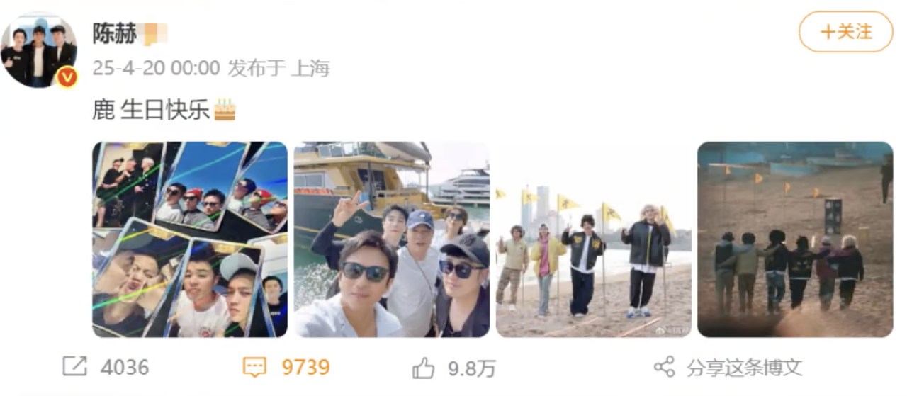 演员邓超、陈赫、王冕,率先发文为鹿晗庆生。4月20日0点,邓超晒出合照并送上生日祝福。陈赫也发布与鹿晗的合影,配文“鹿,生日快乐”。目前,鹿晗的微博头像仍为与邓超、陈赫的合照。