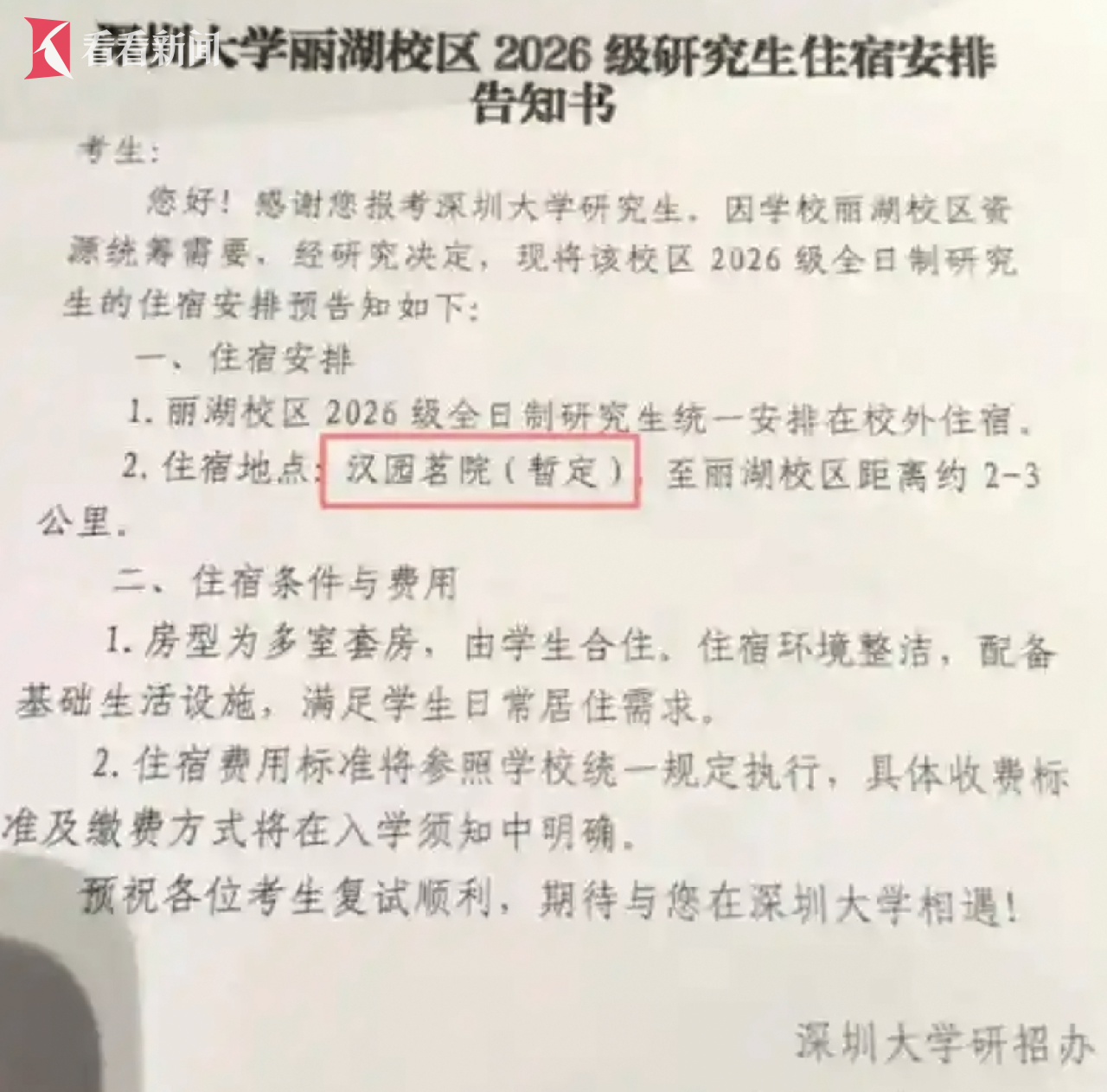掏空六个钱包、斥资800万买入的豪宅,一夜之间要与大学宿舍为邻。昨天,网传一篇《深圳大学丽湖校区2026级研究生住宿安排告知书》把深圳汉园茗院小区和深圳大学丽湖校区同时推向了舆论的风口浪尖。