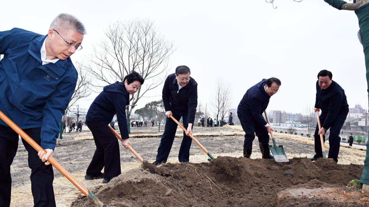 在复兴岛开放空间,陈吉宁龚正黄莉新胡文容参加全民义务植树