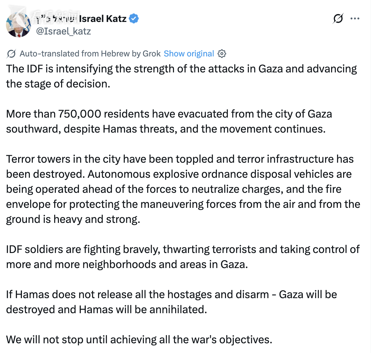 当地时间9月27日,以色列国防部长卡茨发表声明称,目前已有超过75万名平民离开加沙地带,以方在加沙地带的军事行动正进入“决定性阶段”且不会停止,“直至实现所有目标”。
