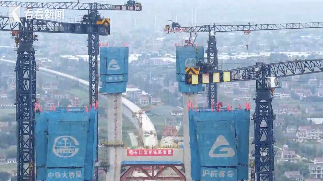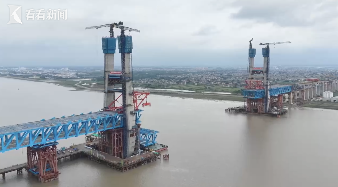 9月29日,在万里长江入海口,崇启公铁长江大桥双主塔同日封顶,大桥由此转入斜拉索挂索施工新阶段。