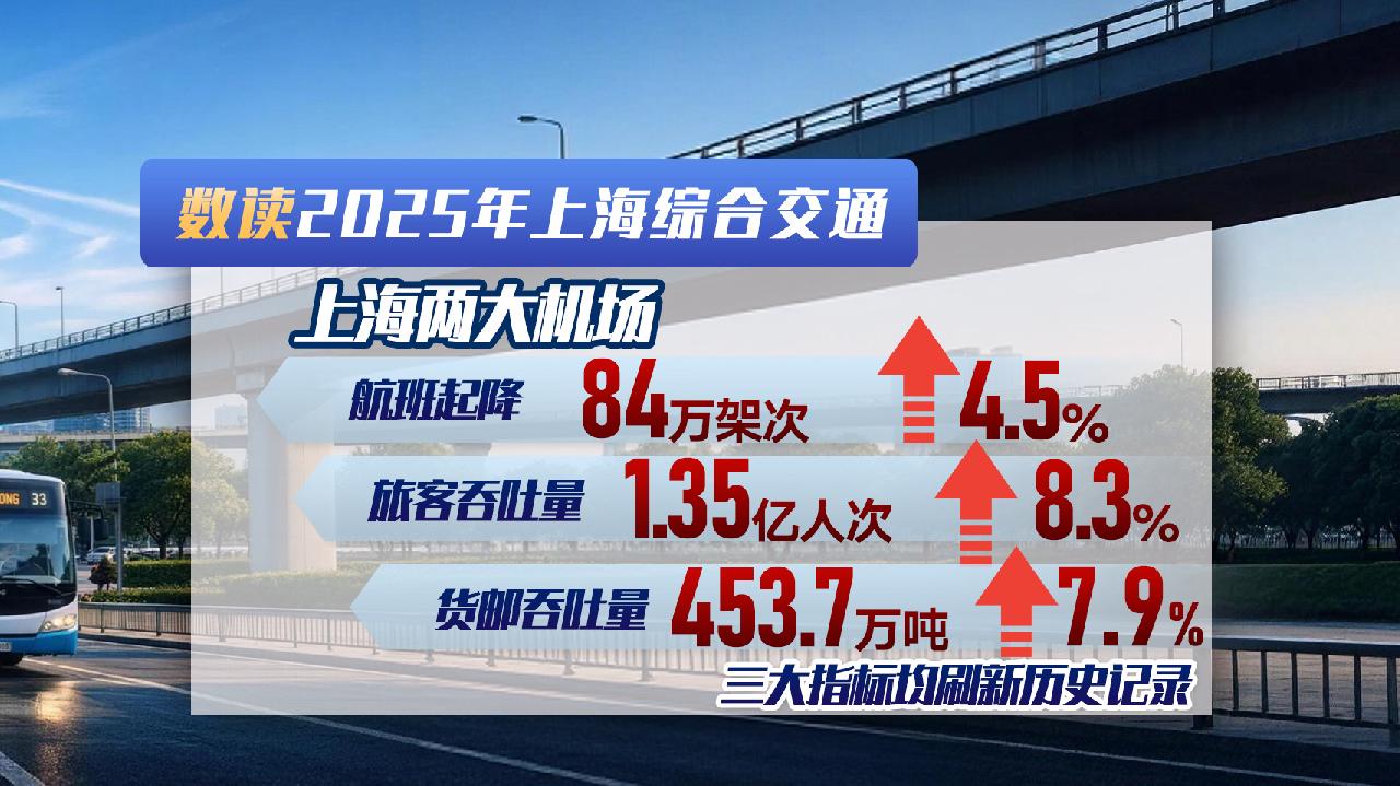 白皮书还提到,2025年,上海国际航空枢纽建设再上新台阶。上海两大机场完成航班起降84万架次,同比增长4.5%;旅客吞吐量1.35亿人次,达到全球第三,同比增长8.3%;货邮吞吐量453.7万吨,同比增长7.9%,三大指标均刷新历史纪录。