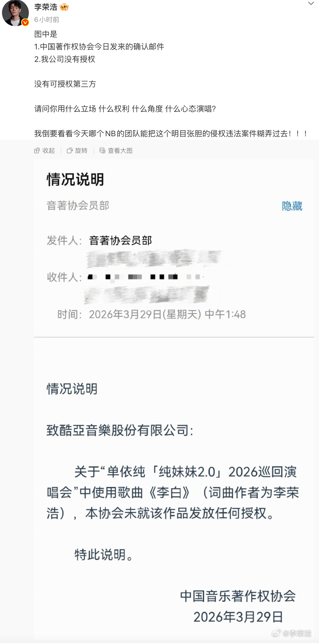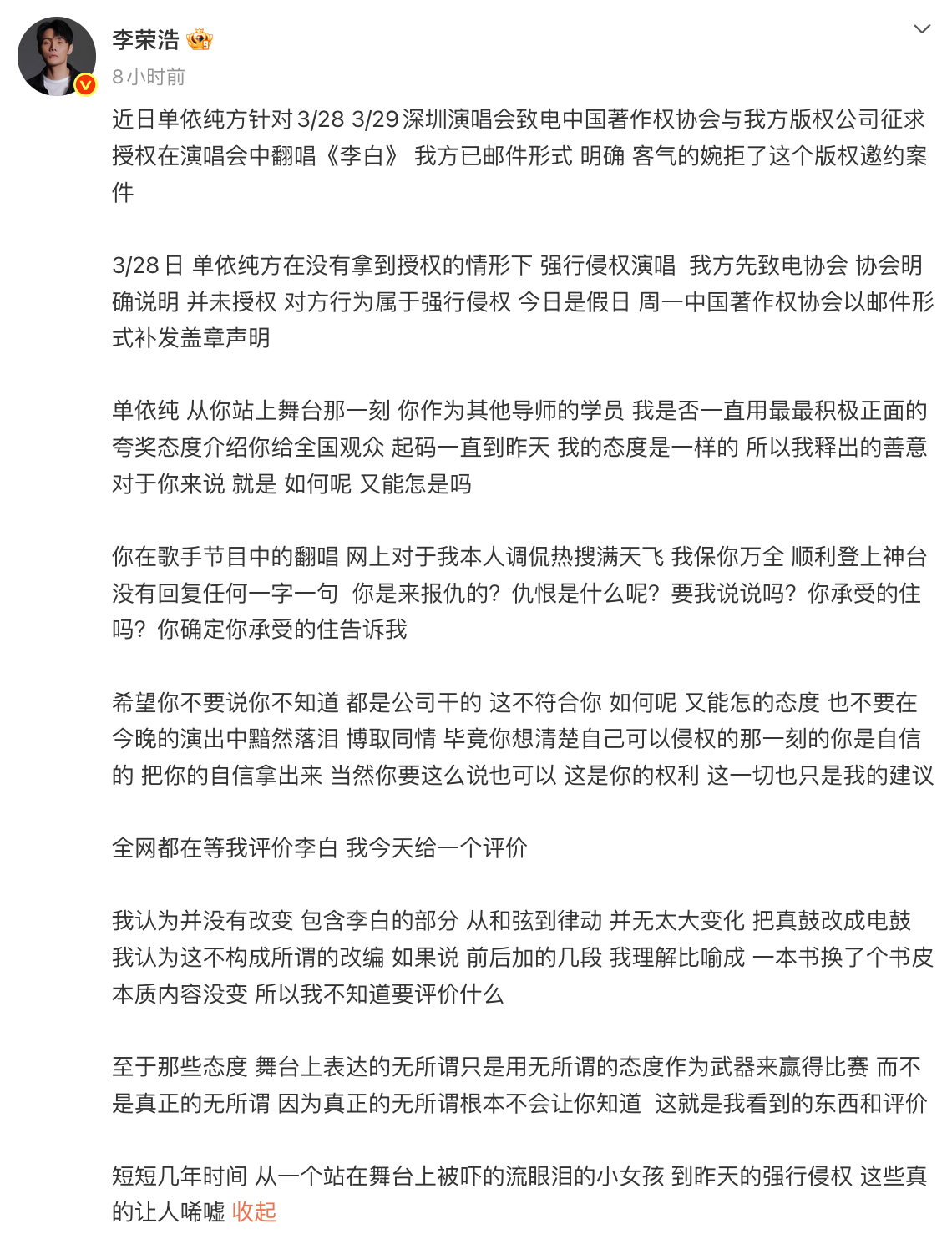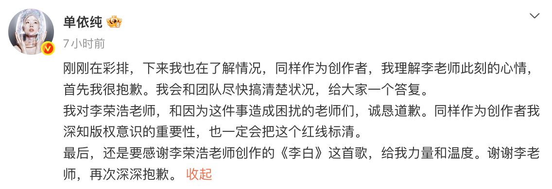 前一晚,她在首场演唱会未经授权翻唱李荣浩的《李白》,引发原唱不满。今天下午,李荣浩公开“四连问”质疑单依纯“你用什么立场、什么权利、什么角度、什么心态演唱?”。并且称早已邮件婉拒其翻唱授权,但对方仍执意强行侵权,目前李荣浩方已向中国音乐著作权协会反映情况。随后单依纯发文致歉,称会和团队尽快核实、明确版权红线。